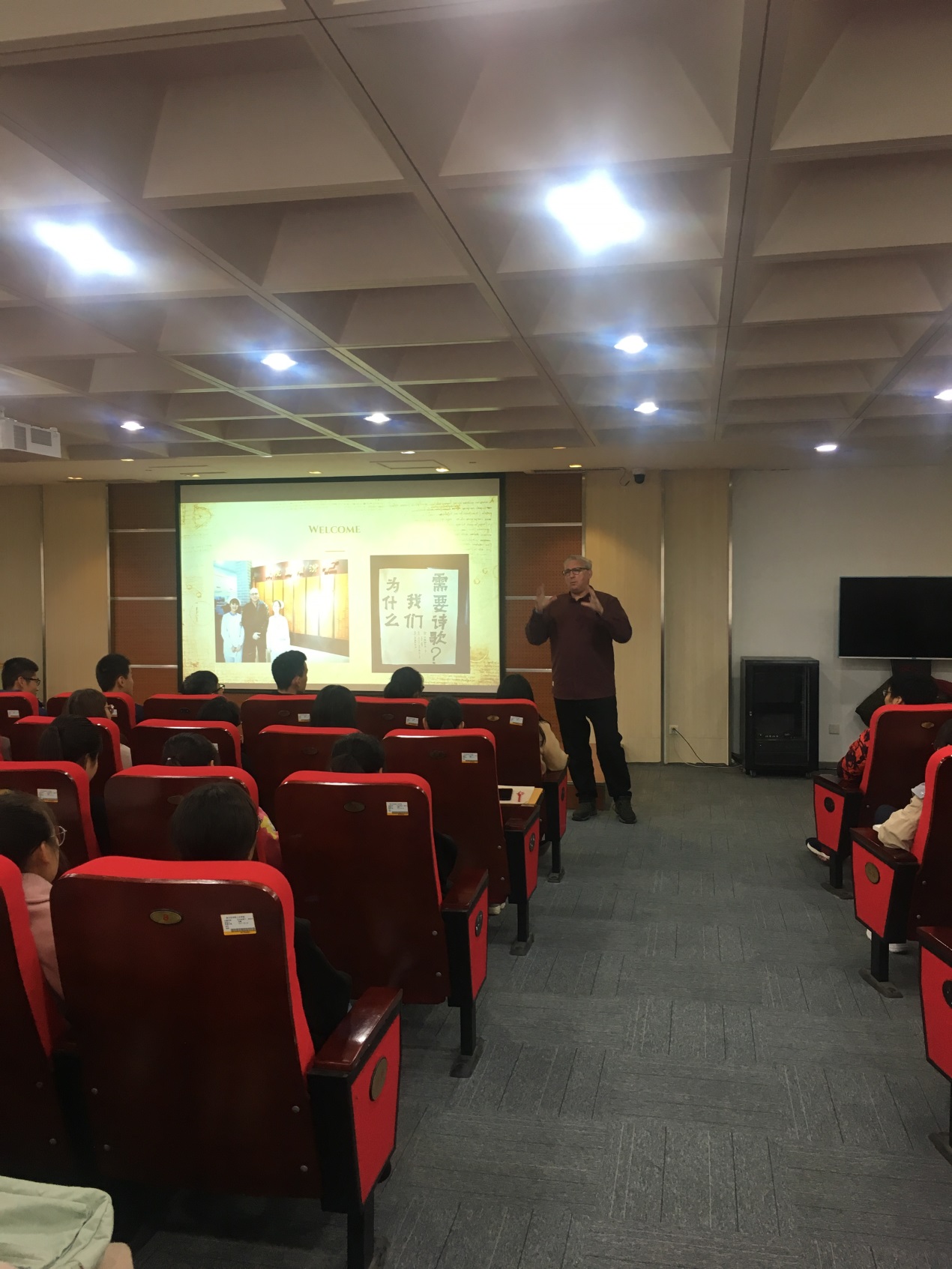 讲座伊始,Andrew用一首名为“Everybody Hurts”的歌曲引发在座师生对于疾病、伤痛与人生的思考,继而通过医学生所熟识的希波克拉底誓言与几首简单易懂的诗歌导入到讲座主题“Poetry in Medicine”,即诗歌在医学中的意义。讲座中,Andrew通过讲述个人经历以及身边故事,让师生切身感受并积极思考诗歌所体现的人文精神对于安抚病患、慰藉心灵的重要意义。他认为诗歌既是情感的宣泄,也承载着记忆,更在一定程度上给我们支持与力量。而后,Andrew通过一个问题“你想成为怎样的医生或护士”引导在座师生体会人文精神对于医学工作者的必要性。