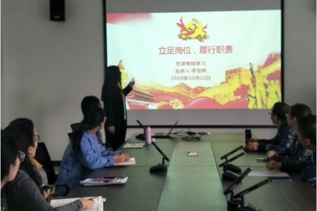 2019年10月22日,我系英语专业教研室支部委员会在行政楼二楼会议室开展了第四季度党课,支部书记李雪峰主持学习本次党课。