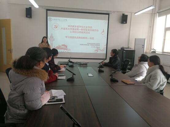 大学英语第二教研室党支部主题党日活动围绕本支部张佳佳和于飙两位优秀民主评议党员教师以及在本职工作中的优异表现,引导全体教师对标先进,争做合格党员,更加紧密地团结在以习近平同志为核心的党中央周围,奋发有为,扎实工作,为实现中华民族伟大复兴的中国梦不懈奋斗。