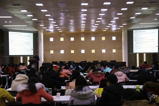 郭尚兴教授首先就翻译学科的重要性及翻译教学质量的衡量标准进行了阐述。继而,郭教授带大家共同回眸了翻译教学与学科建设历程。随后,郭教授又为大家论述了本科翻译教学所涉及的理论问题与多元化的翻译理论。在谈到翻译理论与实践相结合的问题时,郭教授列举了多个具有代表性的英汉翻译实例,阐述了翻译过程中应采用宏观与微观相结合的方法,充分利用英汉对比知识以及各种翻译技巧使译文通顺流畅。之后,郭教授又就翻译专业硕士考试对我院学生进行了详细的介绍。