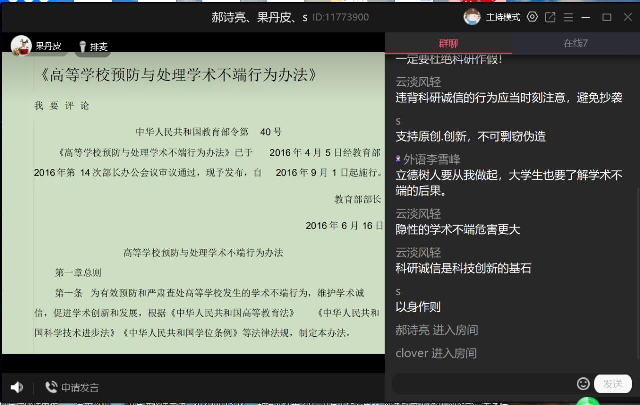 讲座上集中学习并讨论了《高等学校预防与处理学术不端行为办法》、《科研诚信案件调查处理规则(试行) 》、《关于进一步加强科研诚信建设的若干意见》等文件,进一步在思想上统一认识,提升学术道德意识,恪守科学价值准则,坚持诚实守信、追求真理、崇尚创新的学术精神。