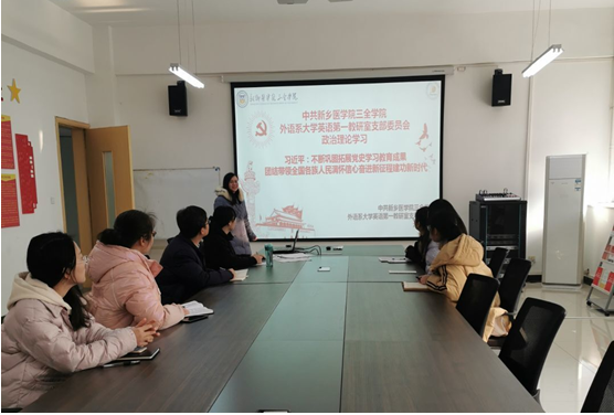 大英一教研室主任党支部的学习由书记温弘主持。党员老师在研读材料后表示集中学习教育有期限,践行初心使命无穷期。党员老师们表示要认真总结这次党史学习教育的成功经验,建立常态化、长效化制度机制,不断巩固拓展党史学习教育成果。支部书记温弘老师提出了自己的看法,她说,作为教师,我们需要承担的最重要的职责就是为国家尽可能多地培养可堪大用能担重任的栋梁之才,但是,打铁还需自身硬。只有自己先学以致用、用以促学、学用相长,才能使自己主导的实践成为正确的而不是盲目的实践,成为系统的而不是零碎的实践,成为有科学根据的而不是想当然的实践。教师需自身源源不断注入新的知识与新的能量,成为一条奔腾不息的河流,与时俱进,这样才能帮助学生“用知识缝制铠甲,用努力成就未来”。
