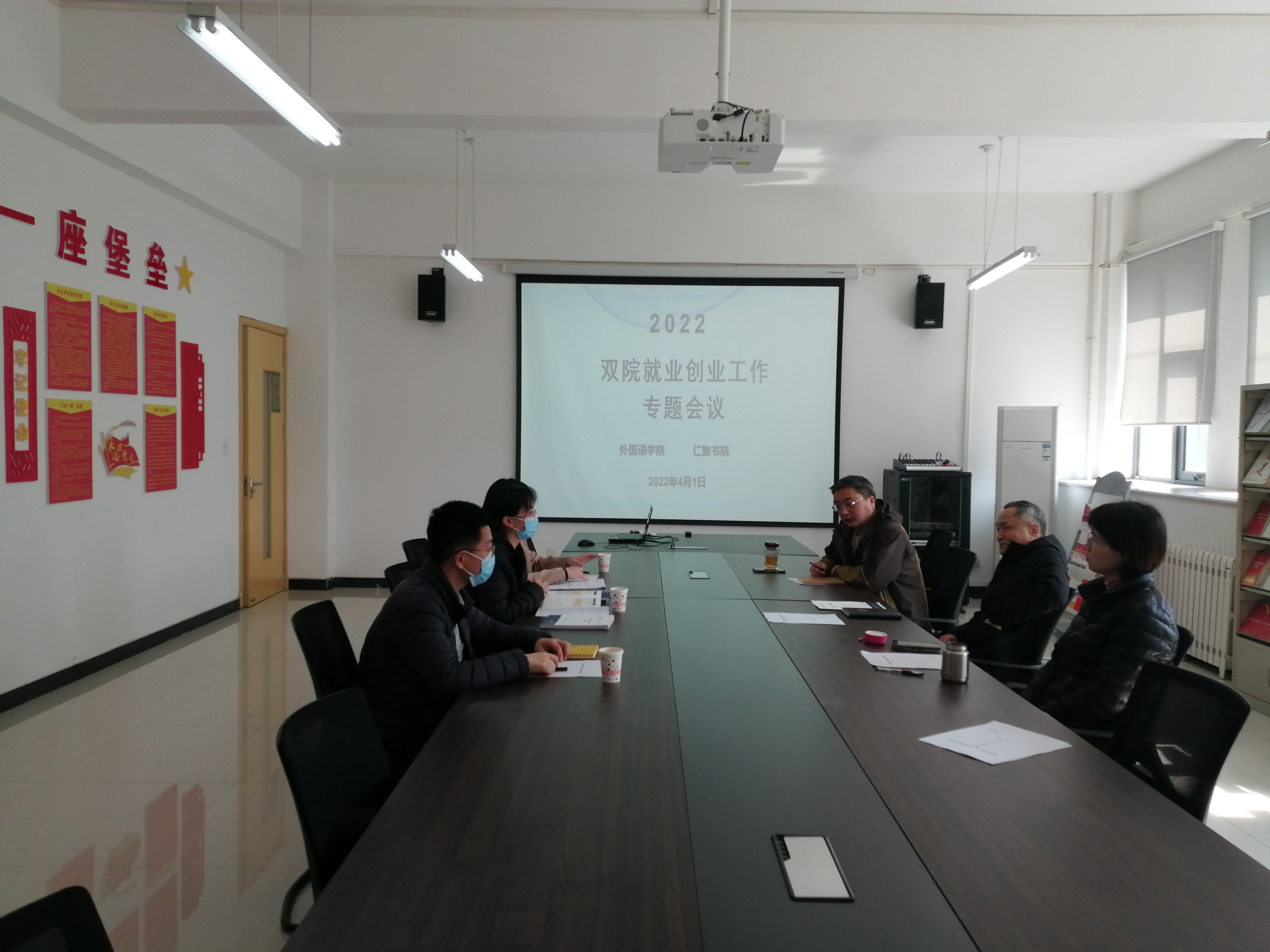 为进一步促进“书院+院系”的双院合力,推动就业创业、协同育人体系发展共建,4月1日,我院与仁智书院就业创业双院沟通交流会顺利召开。我院院长端木庆一,党总支副书记赵元雪,副院长王宝贵分别就本学年毕业生就业创业工作,学业导师工作等事宜同仁智书院书记马苏娟、院务主任窦倩及英语专业辅导员王鹏飞进行了沟通,并就就业创业、班级学风建设、学业导师指导、研究生复试指导等问题达成共识。