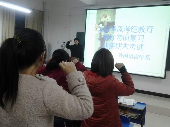 1月8日下午,外国语言学系在问学楼205教室开展关于加强考风考纪,认真复习,诚信考试,迎接期末考试的主题班会暨誓词大会。会议由外国语言学系党总支副书记赵元雪主持,我系全...